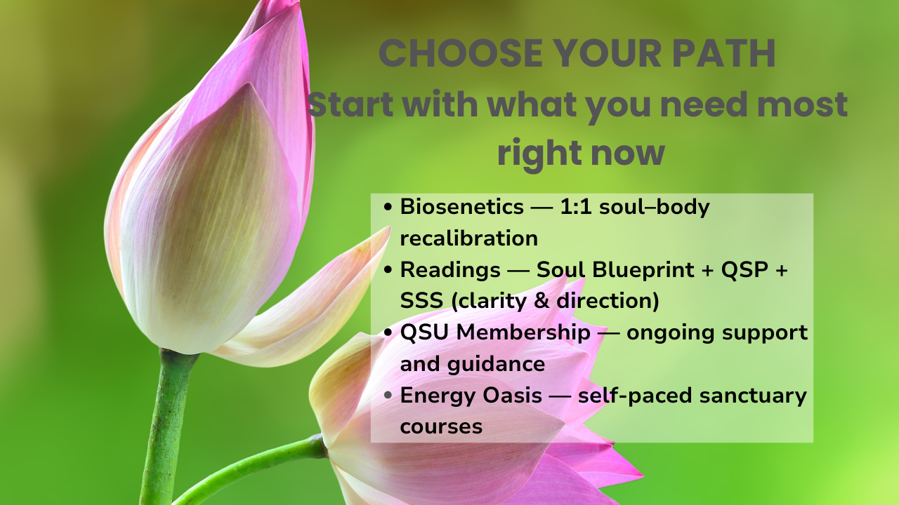 Energy Oasis Part 1 — Awaken and Shine (A$177) Begin creating your inner sanctuary. Includes:• Self-paced course access• Nervous-system-friendly practices• Introduction to Psychic / Metaphysical Energies• Personal Energy Management• Shielding & Protection Practices + Tools BONUS:• 30-day Quantum Soul Upgrade (QSU) membership trial (delivered automatically) Note: The QSU bonus month may include a A$1 activation fee for card verification. Cancel anytime before day 30 ends to avoid being charged the monthly membership.